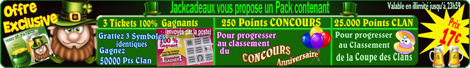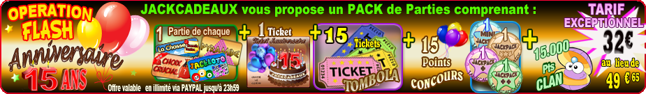 Bonjour, merci WebPatrick pour le lot de 5 JackPack gagnés à la grille aux cadeaux ;) Bons jeux à tous !