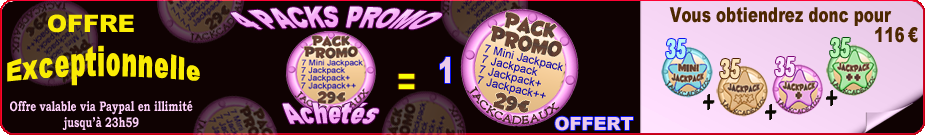 Bonjour, merci WebPatrick pour le lot de 5 JackPack gagnés à la grille aux cadeaux ;) Bons jeux à tous !